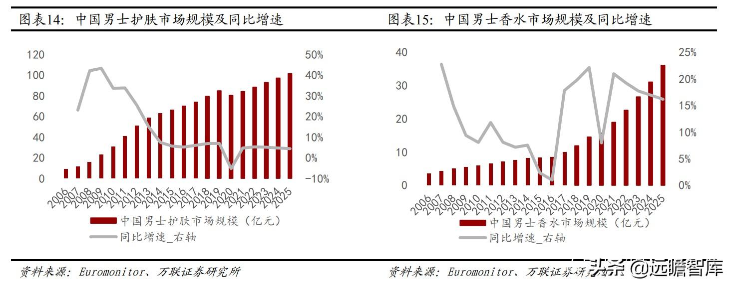 從基礎(chǔ)的清潔產(chǎn)品到面膜、面霜等護(hù)膚產(chǎn)品,再到香水,越來越受到男性消費者的青睞。根據(jù)Euromonitor的數(shù)據(jù),中國男士護(hù)膚市場在2019年達(dá)到85億元,近年來增速維持在7%附近;而中國的男士香水市場則在近年來出現(xiàn)爆發(fā)式增長,2017-2019年CAGR達(dá)到20.9%,未來幾年增速也預(yù)計維持在15%以上。