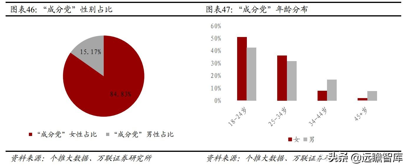 “成分黨”的規(guī)模在不斷壯大,“95后”、女性、高消費人群是“成分黨”的主力軍。根據(jù)個推大數(shù)據(jù)顯示,“成分黨”中有84.8%是女性,男性占比為15.17%;從年齡分布來看,“成分黨”中有50%左右是18-24歲的“95后”;從消費水平來看,“成分黨”中高消費群體占比約為50%。