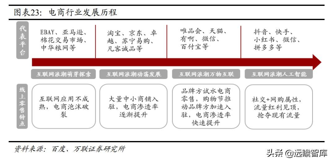 電商行業(yè)高速發(fā)展,近年來新興社媒平臺的崛起分流線上流量。2003年,以淘寶、京東為代表的電商平臺相繼成立,大量商鋪入駐這些電商平臺,我國電子商務(wù)市場由此蓄力發(fā)展。2008年,以天貓為代表的 B2C 平臺成立,為品牌商轉(zhuǎn)型線上零售提供了低成本的試錯機會,大量品牌商入駐平臺。