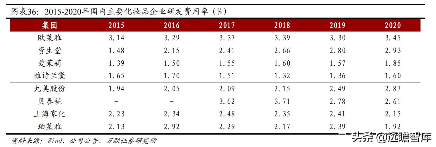 從研發(fā)費用率來看,國內(nèi)外美妝企業(yè)的研發(fā)費用率大體維持在1.5%-3.5%之間,其中歐萊雅從2015年的3.14%提升至2020年的3.45%,位居各集團(tuán)之首;國內(nèi)美妝集團(tuán)中,2020年,丸美股份、貝泰妮的研發(fā)費用率分別為2.87%、2.61%,位列第一和第二。