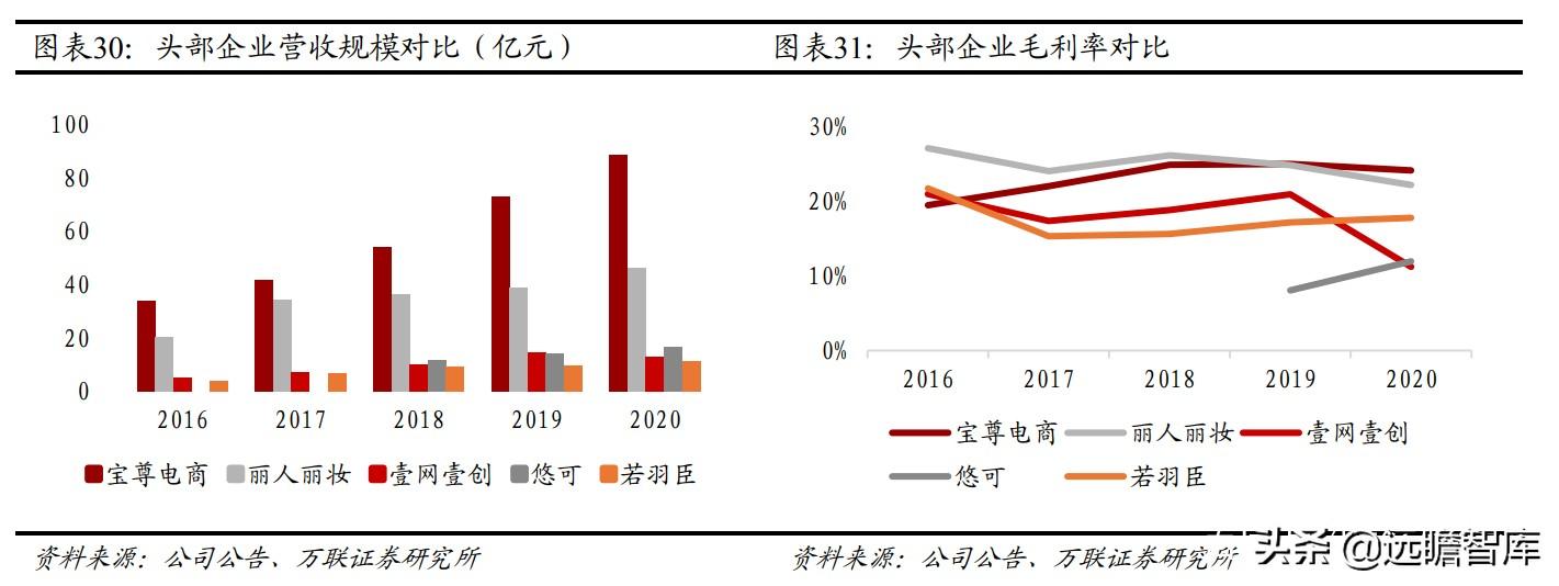 而隨著線上平臺渠道逐漸豐富,營銷方式日漸創(chuàng)新,線上運營的難度也隨之提高,對服務(wù)商運營率提出更高要求,精細(xì)化、專業(yè)化趨勢顯著。頭部玩家的運營團(tuán)隊設(shè)置更為專業(yè),規(guī)模大且資金較為充足,能夠更快地調(diào)整運營策略、向外布局新渠道以適應(yīng)行業(yè)轉(zhuǎn)型需求;而中小服務(wù)商營銷資源較為缺乏、多渠道布局能力較弱,行業(yè)轉(zhuǎn)型下調(diào)整難度加大。預(yù)計隨著行業(yè)轉(zhuǎn)型深入會加速中小服務(wù)商的清場,頭部玩家如寶尊電商、麗人麗妝、壹網(wǎng)壹創(chuàng)、悠可等的優(yōu)勢將凸顯,市場集中度將加速提升。