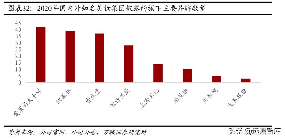 以國際頭部美妝集團(tuán)為例,目前均以集團(tuán)的形式經(jīng)營,旗下?lián)碛斜姸嗥放?,例如愛茉莉太平洋、歐萊雅、資生堂旗下品牌數(shù)量均超過35個。