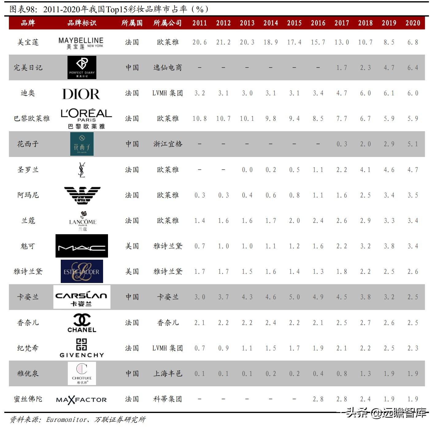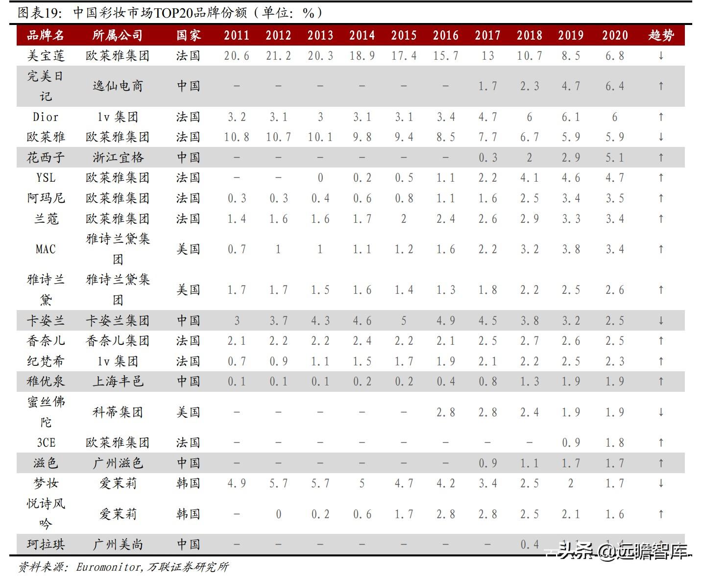 分品類來看,彩妝品類Top20的國貨品牌份額提升。2020年,日記以6.4%的份額位居第2,較2017年大幅提升4.7個pct,并一舉超越Dior、歐萊雅、YSL、阿瑪尼等國際;而花西子、稚優(yōu)泉、滋色等國貨品牌也有的提升。