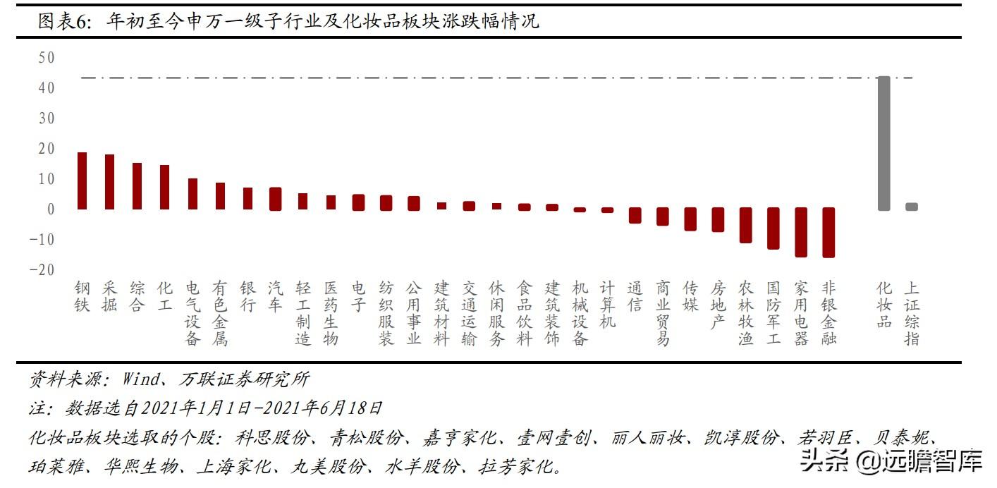 從年初至今(2021年1月1日至2021年6月18日,下同),化妝品板塊上漲43.36%,對標(biāo)申萬一級行業(yè)漲跌幅,化妝品表現(xiàn)超過所有板塊,大幅跑贏上證綜指41.86個pct。