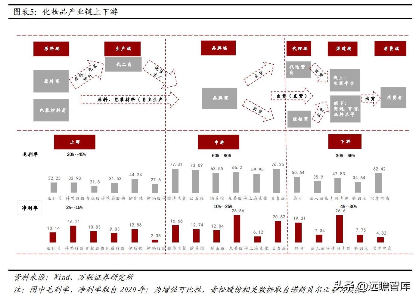 化妝品行業(yè)的產(chǎn)業(yè)鏈可拆解為上游原料端和生產(chǎn)端,中游品牌端,下游和代理、渠道端和終端消費者。