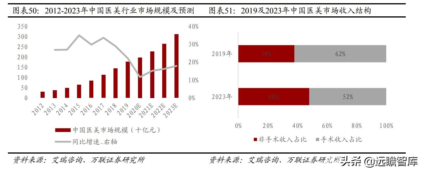 受顏值經(jīng)濟與網(wǎng)紅文化的影響,我國醫(yī)美市場高速發(fā)展。根據(jù)艾瑞咨詢的數(shù)據(jù),2019年中國醫(yī)美市場規(guī)模達(dá)到1769億元,2012-2019年CAGR達(dá)29%,其中,非手術(shù)類收入占比為38%,手術(shù)收入占比為62%,預(yù)計到2023年,非手術(shù)類收入占比將進(jìn)一步提高至48%。