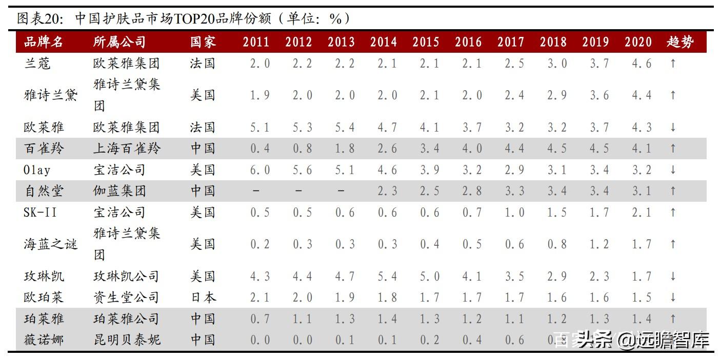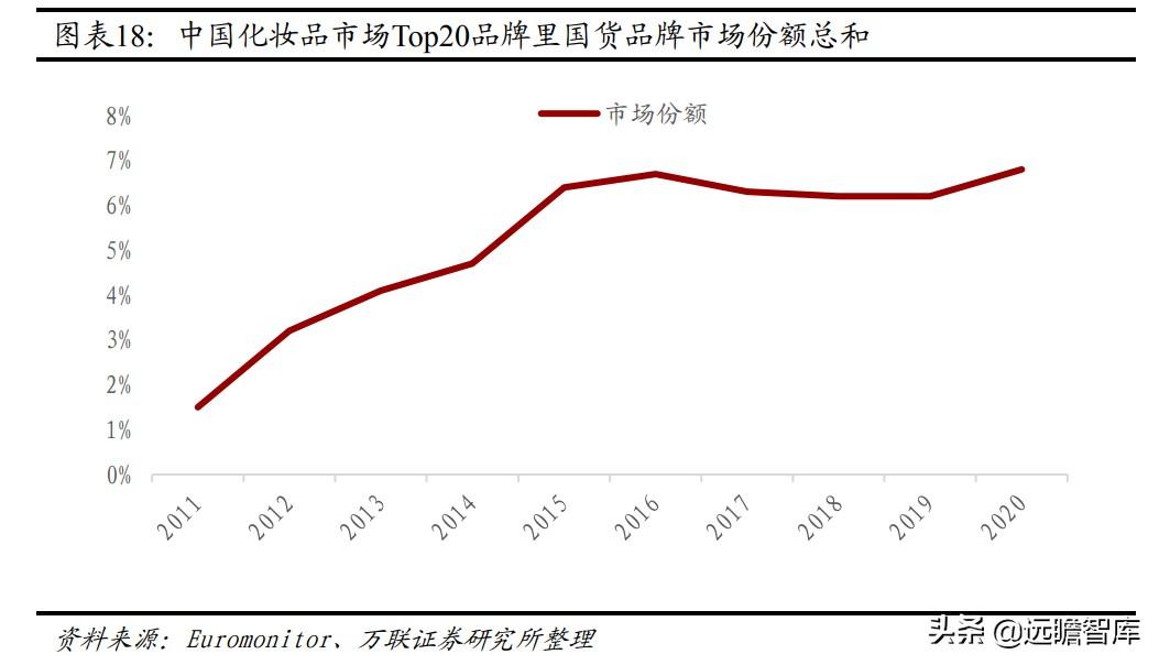 根據(jù)Euromonitor的數(shù)據(jù)顯示,中國化妝品市場Top20品牌中,國貨品牌的市場份額在逐年上升,2011年國貨品牌份額只有1.5%,到2020年提升7.7個pct至9.2%。