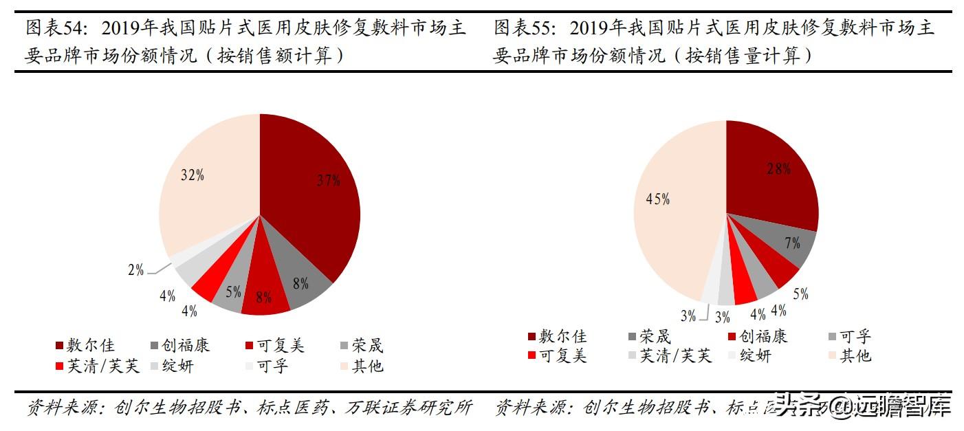 據(jù)創(chuàng)爾生物的招股書顯示,醫(yī)用皮膚修復(fù)敷料可以分為貼片式和非貼片式兩大類,其中貼片式是主流,更加適用于皮膚修復(fù)。我國貼片式醫(yī)用皮膚修復(fù)敷料消費量從2017年的1.61億片提升至2019年的3.37億片,CAGR高達(dá)44.6%。且該市場集中度高,市占率(按銷售額計算)排名前7的品牌占據(jù)了全市場接近70%的份額,包括敷爾佳、創(chuàng)???、可復(fù)美、榮晟、芙清、綻妍、可孚。