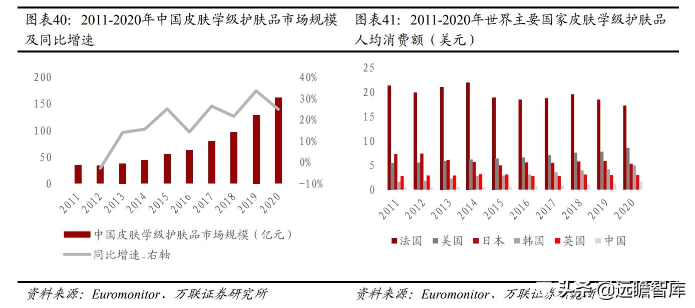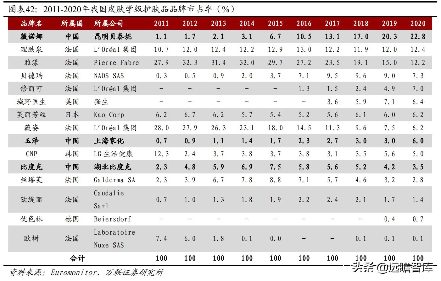 2020年,薇諾娜/玉澤在皮膚學(xué)級護(hù)膚品市場中的份額分別為22.8%/6.0%,排名為第1和第9,近年來均快速提升并超越不少外資品牌。