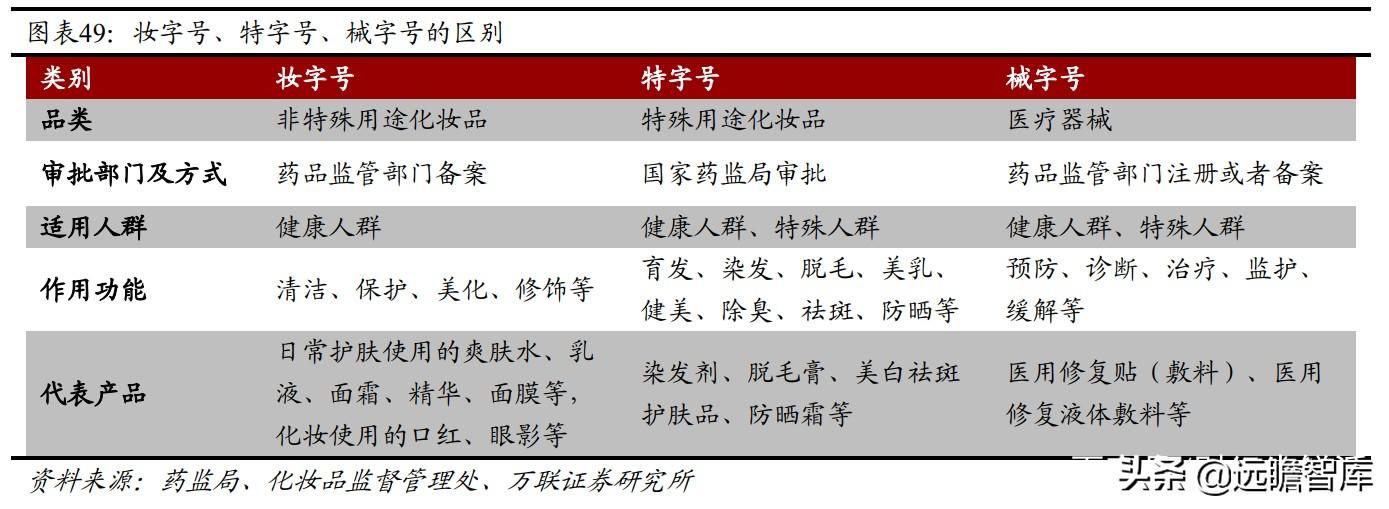 醫(yī)美級護(hù)膚品主要是指用于醫(yī)美術(shù)后修復(fù)、敏感肌、激素臉等皮膚修復(fù)的“械字號” 產(chǎn)品,實質(zhì)屬于醫(yī)療器械,必須遵守規(guī)定的《醫(yī)療器械生產(chǎn)質(zhì)量管理規(guī)范》,所 使用的原料和包裝需要經(jīng)過無菌生產(chǎn)和消毒,產(chǎn)品不添加任何激素、抗生素、重金屬 及其他引起皮膚反應(yīng)的成分,在臨床驗證、功明確、使用后反應(yīng)等各方面的要求均 高于“妝字號”普通化妝品。