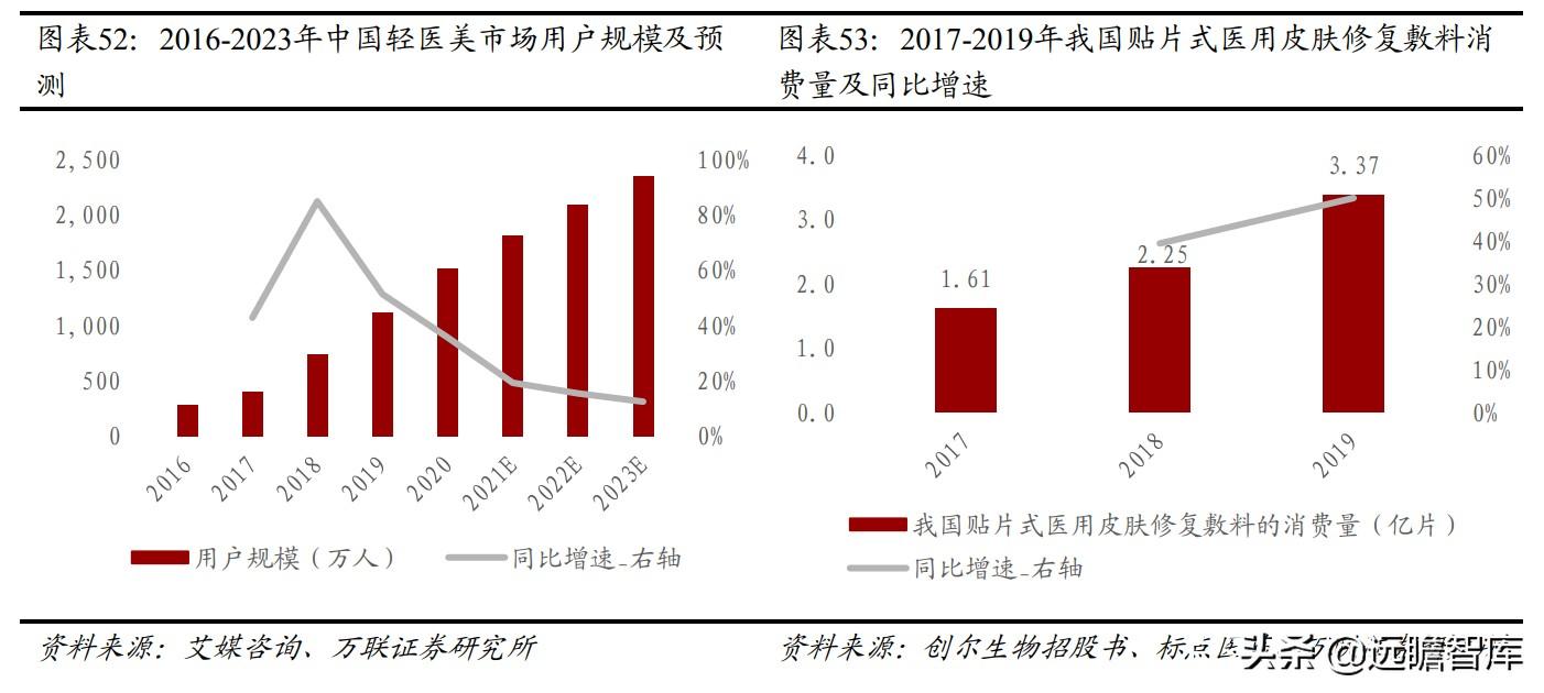 非手術(shù)類醫(yī)美(輕醫(yī)美)例如光子嫩膚、激光祛斑、玻尿酸/膠原蛋白注射等,由于其性較手術(shù)類醫(yī)美高、見快等優(yōu)點,更加容易被消費者接受,而在完成非手術(shù)類醫(yī)美(輕醫(yī)美)如光子嫩膚、激光祛斑、熱瑪吉等之后急需皮膚的修復(fù),這將催生更為廣闊的醫(yī)美級護(hù)膚品例如醫(yī)用皮膚修復(fù)敷料的市場。