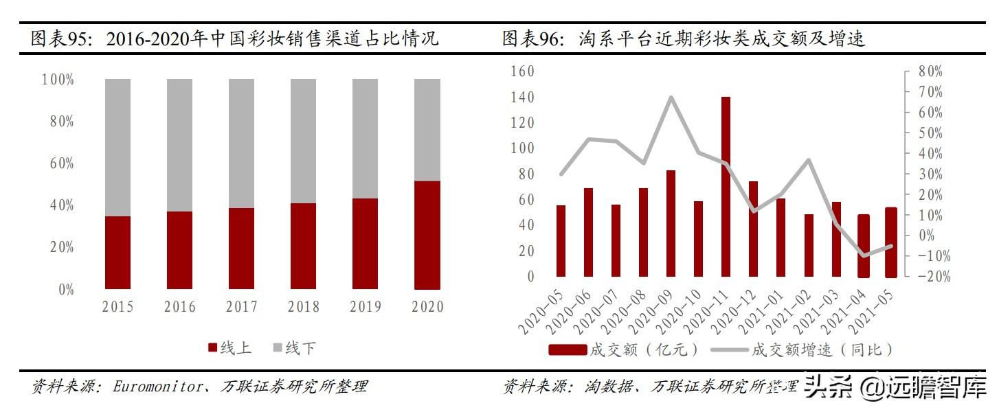 在線上營銷的催化下,30歲以下美妝人群占比從2019年的60.8%提升到2020年65.1%,增長4.3%,彩妝銷售線上渠道占比從2015年的34.7%上升至2020年的51.8%,增長17.1%。新增長的消費力量不容小覷。