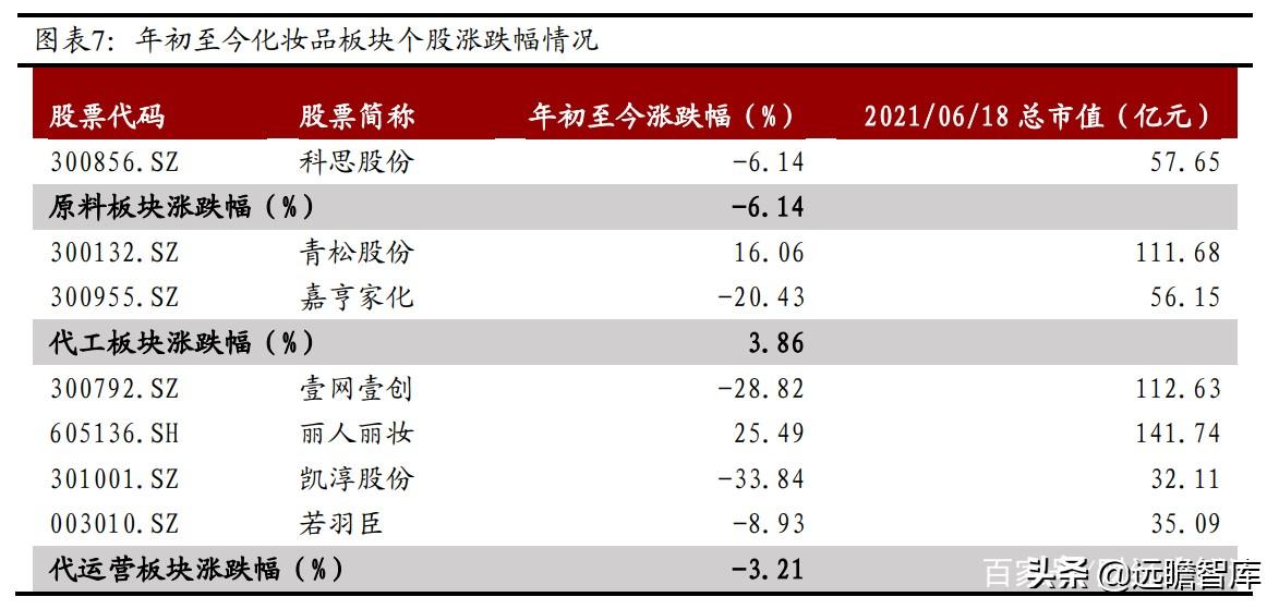 年初至今,由于華熙生物、拉芳家化、上海家化、貝泰妮漲幅較大,品牌板塊共計上 漲50.65%,位列四個子板塊中第一。原料板塊和代運營板塊分別下跌6.14%和3.21%,其中,代運營板塊中,麗人麗妝表現(xiàn)較好,原料板塊中的科思股份則表現(xiàn)相對較弱。代工板塊上漲3.86%,其中青松股份表現(xiàn)尚佳。