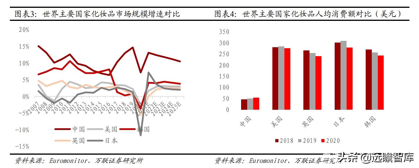 盡管中國化妝品市場規(guī)模龐大且增速超越美國、英國、日本等發(fā)達(dá),但從人均消費角度而言,仍然有較大提升空間。