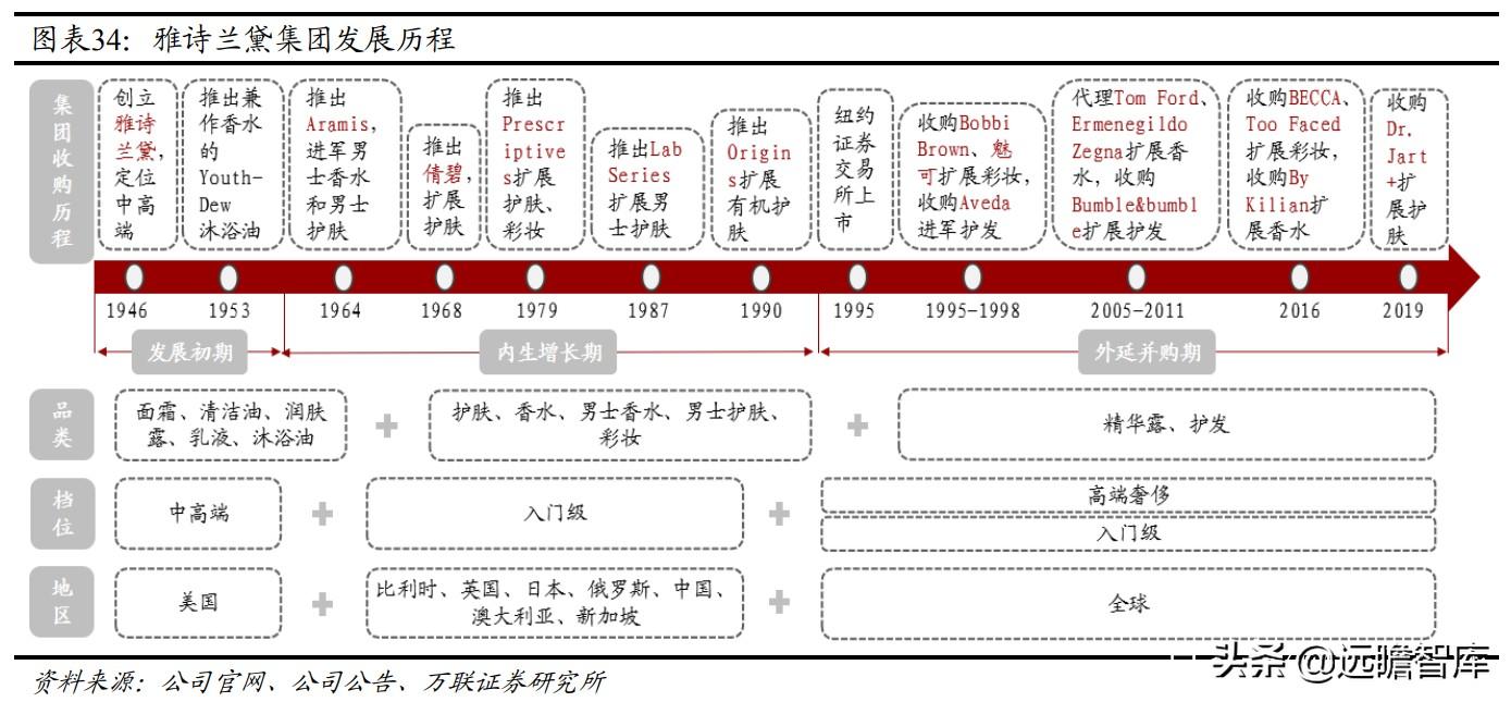 案例②:雅詩蘭黛——初創(chuàng)定位中高端,此后通過“內(nèi)生+外延”成長為美妝巨頭