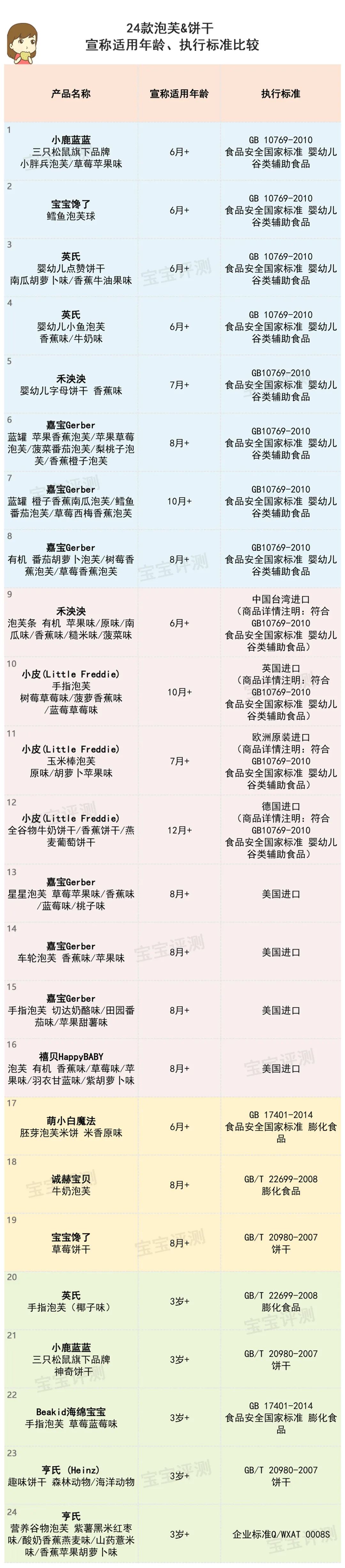 3、24款泡芙&餅干執(zhí)行標(biāo)準(zhǔn)篩查根據(jù)產(chǎn)品執(zhí)行標(biāo)準(zhǔn)的情況,以及宣稱適用年齡,笨爸爸對(duì)網(wǎng)購平臺(tái)及微商渠道熱銷的24款泡芙、餅干進(jìn)行了對(duì)比篩查,結(jié)果如下: