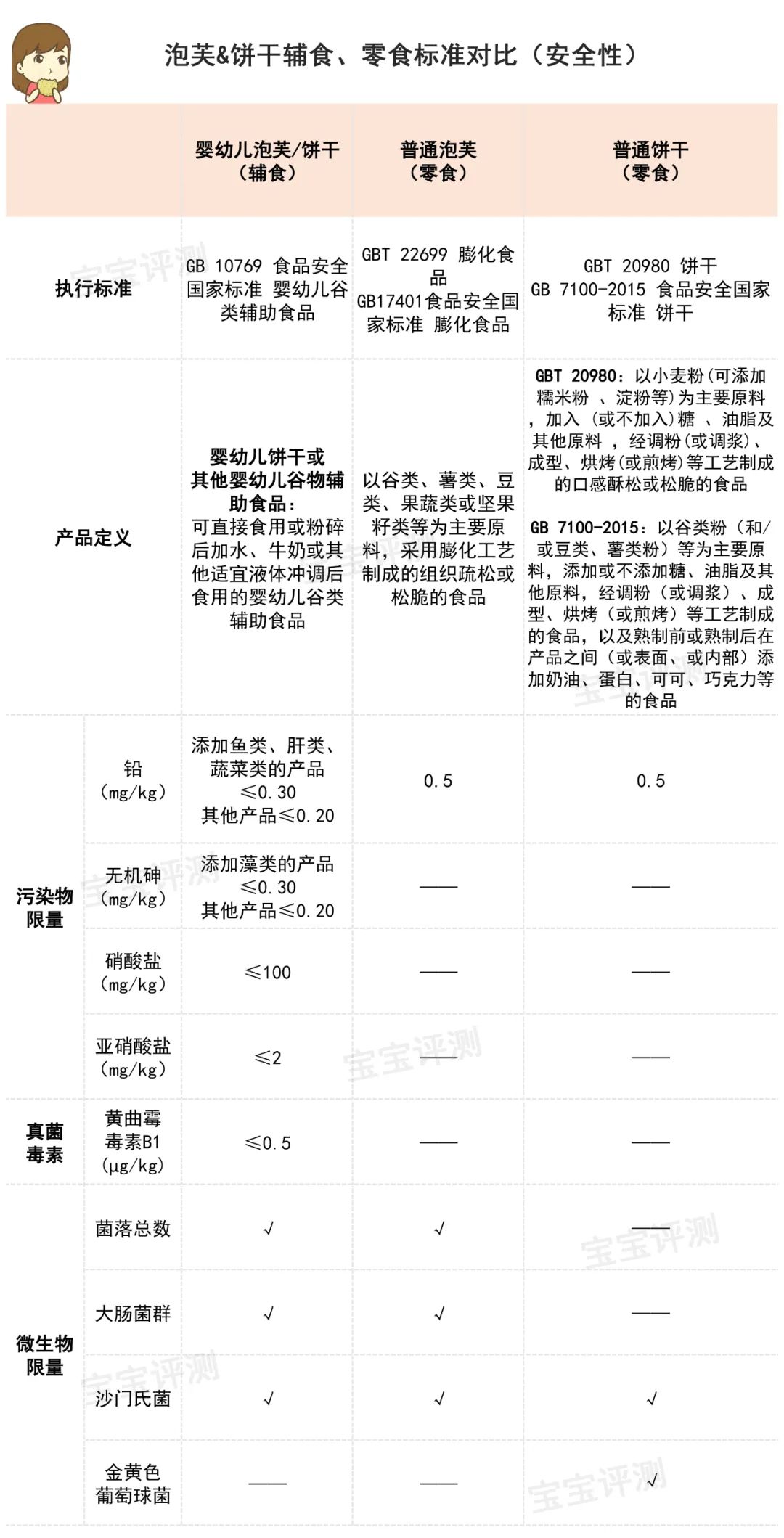 所以,給0~3歲寶寶選擇泡芙、餅干,應(yīng)該選擇執(zhí)行輔食國標(biāo)的產(chǎn)品,而非普通膨化食品或餅干標(biāo)準(zhǔn)的產(chǎn)品。