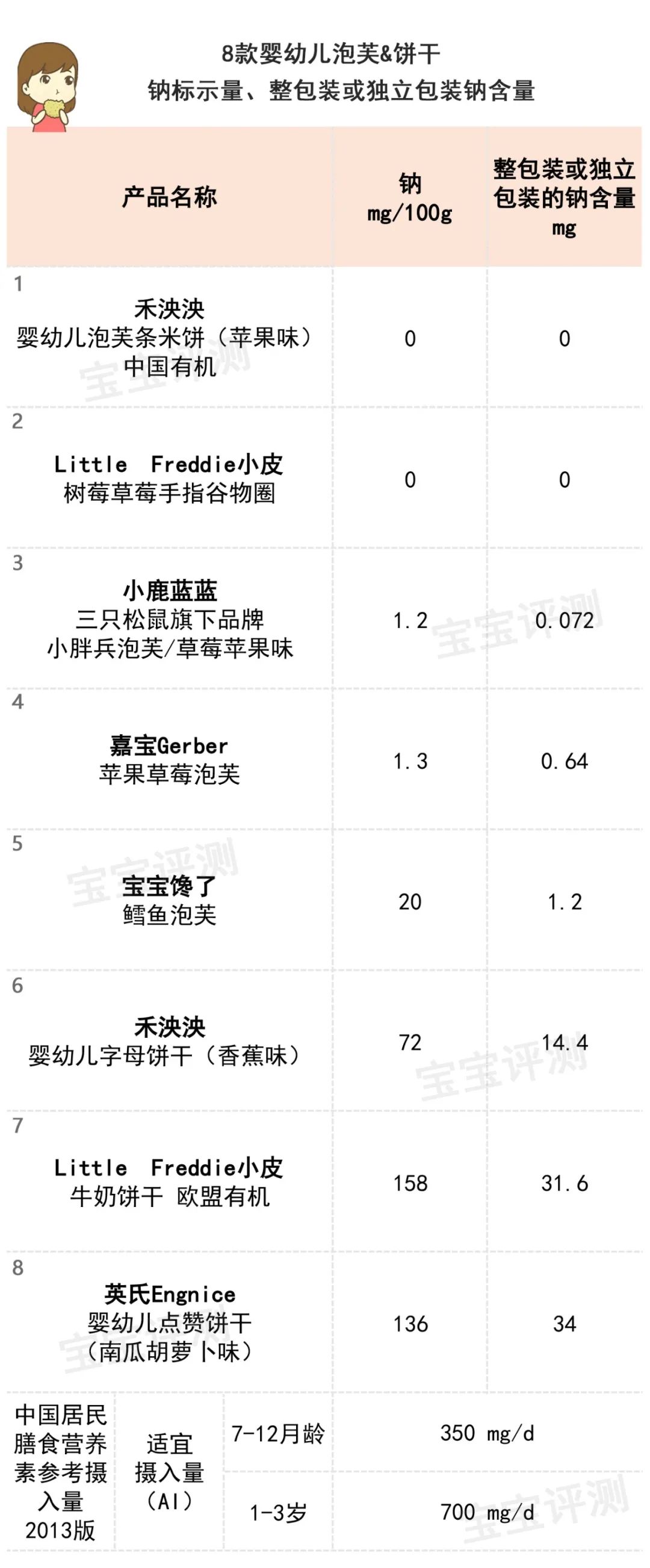 根據(jù)GB 28050-2011《預(yù)包裝食品營養(yǎng)標(biāo)簽通則》,含鈉≤120mg/100g (固體)或100ml (液體)為低鈉食品。除了小皮、英氏兩款餅干,其它6款泡芙或餅干均屬于低鈉食品。