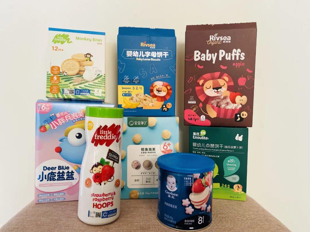 5、8款輔食泡芙、餅干從口感上來講,都比較好吃,易抓取食用,軟硬程度及口感均適中。