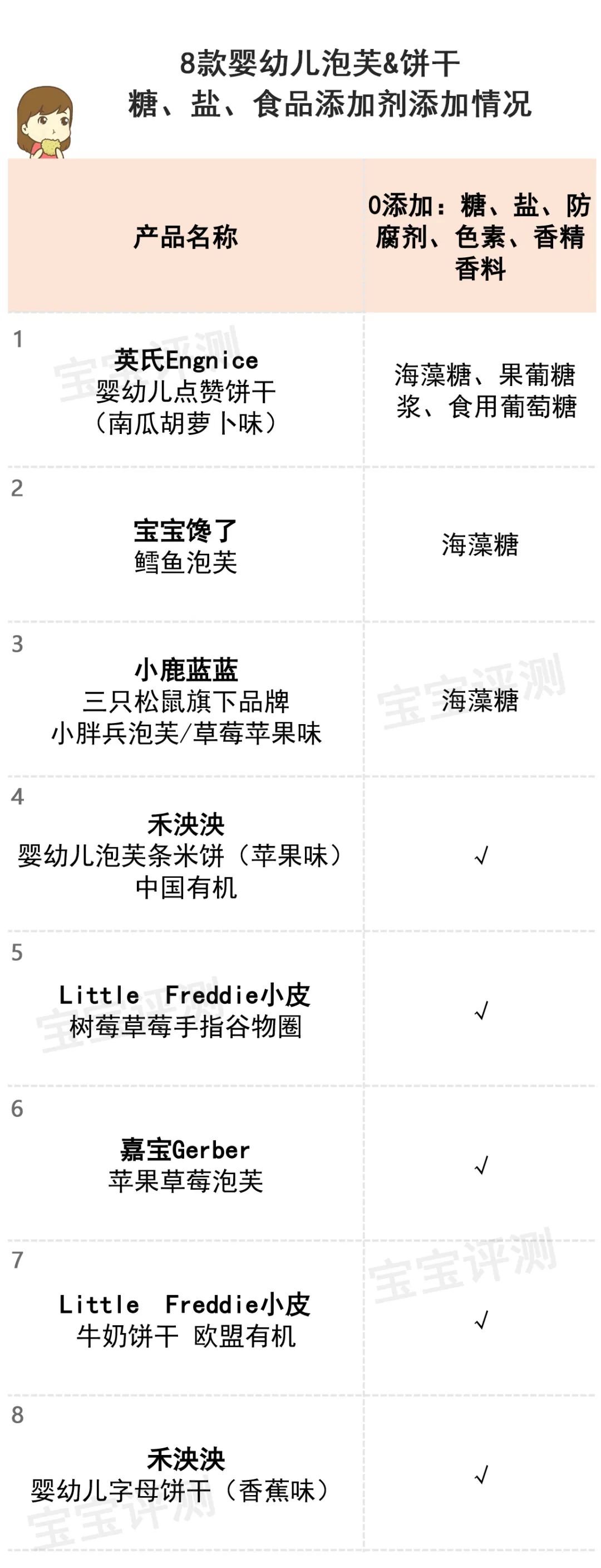 評(píng)測(cè)的8款泡芙、餅干中,小鹿藍(lán)藍(lán)、寶寶饞了、英氏添加有糖。