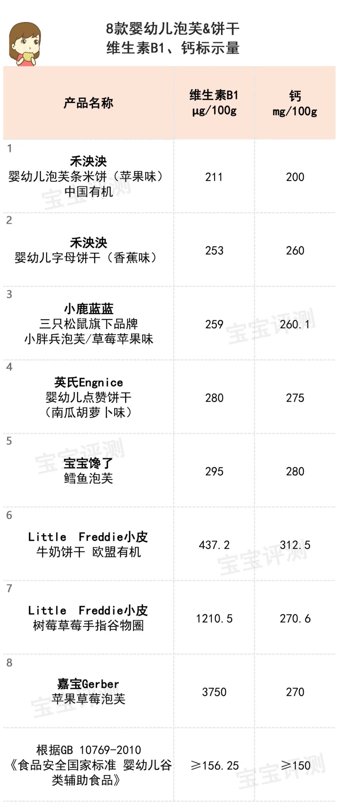 8款產(chǎn)品均達(dá)到國標(biāo)要求的低維生素B1和鈣含量。其中,小皮和嘉寶泡芙的含量更高一些。