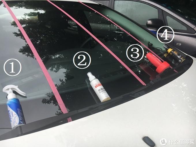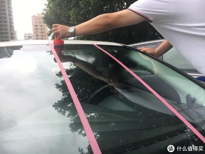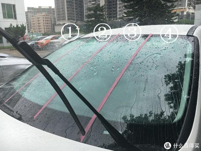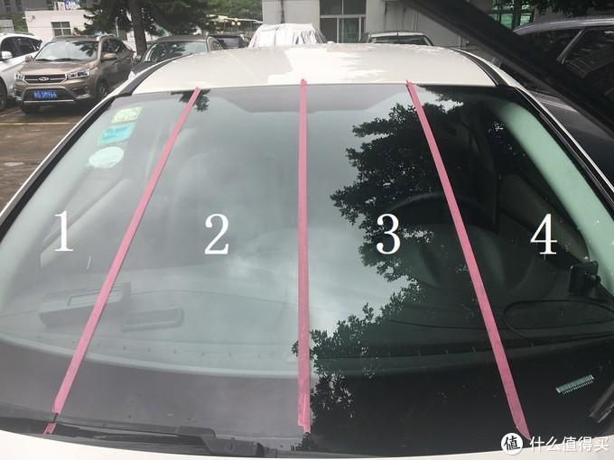 為了比對(duì)果,我模仿了一下網(wǎng)友的做法,用紅膠紙把前擋玻璃分成4個(gè)板塊,然后分別進(jìn)行施工、試驗(yàn)