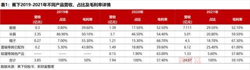 2019-2021年,蕉下傘具營收占總營收的比重則由86.9%下降至20.8%。服裝和配飾(墨鏡、口罩、披肩、袖套和手套)的營收占比上升快,服裝由0.8%上升至29.5%,配飾由5.3%上升至25.4%。蕉下成功地將防曬傘這一爆款單品積累的口碑,轉(zhuǎn)化到了服裝和配飾品類上。
