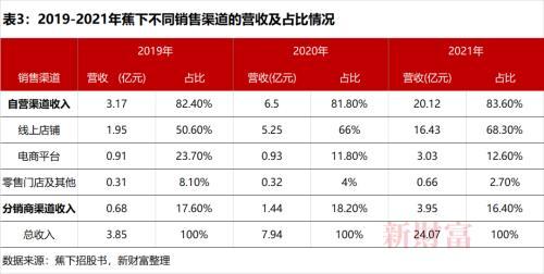 除自營渠道外,蕉下也與分銷商合作銷售產(chǎn)品,2019-2021年,蕉下分銷商數(shù)量分別為96家、274家及872家,3年增長8倍。對應(yīng)的是,分銷渠道創(chuàng)收增長4.8倍,2019-2021年復(fù)合增長率高達(dá)79.77%(表3)。但分銷商的營收占比同樣始終未超過20%,從2019年的17.6%下降至2021年的16.4%。