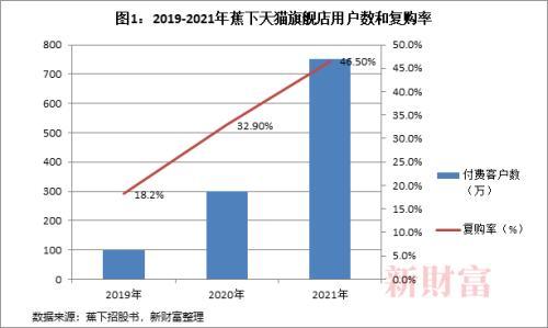 蕉下的在線店鋪銷售收入從2019年的1.95億元增加至2021年的16.43億元,增長7.43倍。主要由于蕉下天貓旗艦店的付費(fèi)客戶總數(shù)由2019年的100萬人增加至2021年的750萬人,天貓旗艦店的復(fù)購率由2019年的18.2%上升至2021年的46.5%(圖1)。