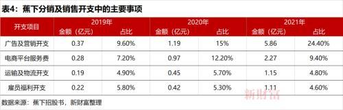 但是,倚重營銷的蕉下,龐大的銷售費(fèi)用卻極大地吞噬了利潤。2019-2021年,蕉下的分銷及銷售開支由1.25億元增至11.04億元,分別占營收的32.4%、40.7%、45.9%,其中,廣告及營銷開支、電商平臺服務(wù)費(fèi)是大頭(表4)。