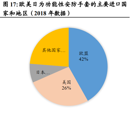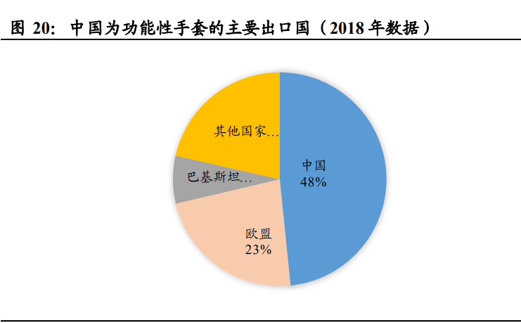 中國、歐盟、巴基斯坦為主要的出口和地區(qū),中國占比接近一半。 2018 年中國、歐盟、巴基斯坦合計出口額約占功能性安防手套總出 口額的 79%,其中中國占出口額的比例約為 48%,在功能性手 套供應(yīng)鏈中擔(dān)任制造中心的重要地位。