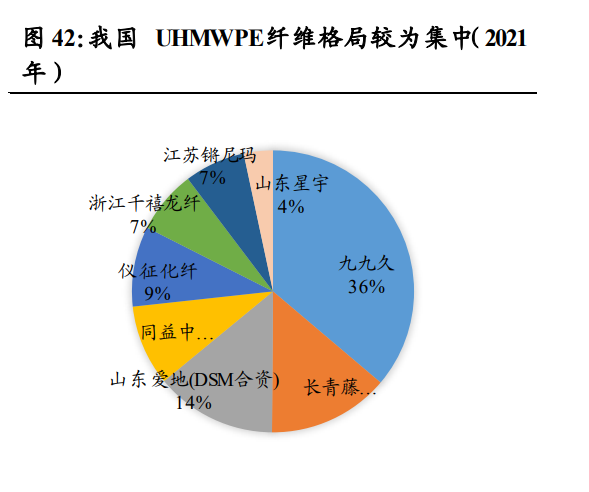 國內(nèi) UHMWPE 纖維格局較為集中,九九久、長青藤位居行業(yè)前二。 2021 年,公司“超纖維新材料及功能性安防用品開發(fā)應(yīng)用項目(一期)” 順利投產(chǎn),形成 600 噸 UHMWPE 纖維產(chǎn)能,初步實現(xiàn)“從 0 到 1”的 突破,但規(guī)模較國內(nèi)其他企業(yè)仍有較大差距。截至 2021 年,國內(nèi)九九久 公司的 UHMWPE 纖維產(chǎn)能為 1.3 萬噸,居行業(yè)之首,市占率約為 32%; 長青藤排名第二,此外,產(chǎn)能達千噸級別的還有山東愛地(DSM 合資公 司)、同益中等。