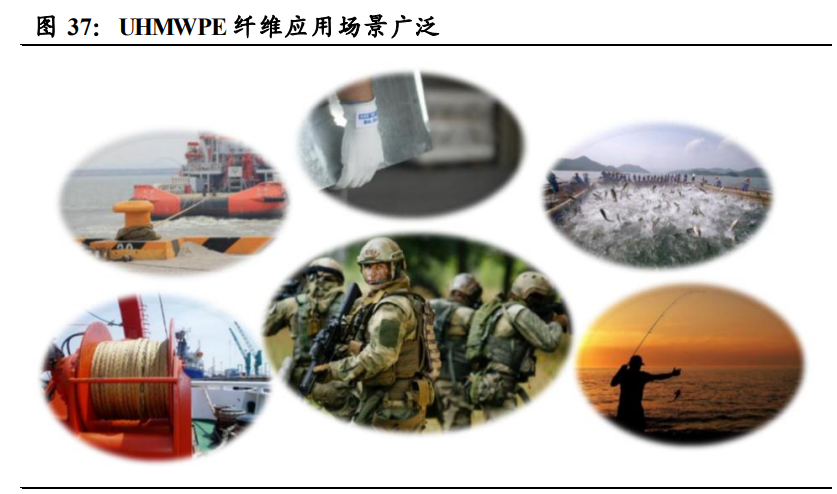 UHMWPE 纖維性能優(yōu)越,下游應(yīng)用場景廣泛。UHMWPE 纖維,即超 高分子量聚乙烯纖維,指分子量在 100-500 萬的聚乙烯所制成的纖維, 與碳纖維、芳綸纖維合稱為“三大高性能纖維”,是目前世界上比強度和 比模量高的纖維,既可應(yīng)用于安防手套、體育器材等民用領(lǐng)域,也可 廣泛應(yīng)用于軍工裝備、航空航天等軍用領(lǐng)域。