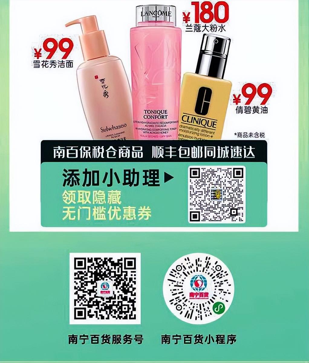 另外,即日起至4月8日,進入南寧百貨大樓微信小程序,線上購進口護膚品享好價低扣,蘭蔻粉水低至180元,倩碧黃油低至99元。南百保稅倉同城發(fā)貨,順豐包郵到家。