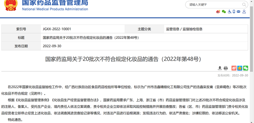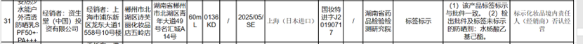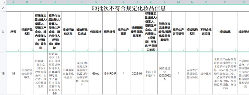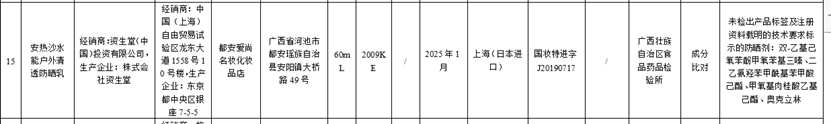 無獨有偶,今年9月30日,藥監(jiān)局關(guān)于20批次不符合規(guī)定化妝品的通告中,也有資生堂的安熱沙水能戶外清透防曬乳。