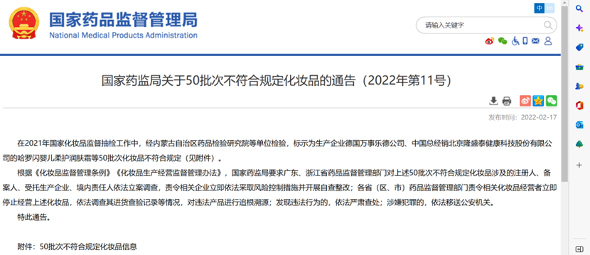 今年2月17日,藥監(jiān)局關(guān)于50批次不符合規(guī)定化妝品的通告中,資生堂的安熱沙水能戶外清透防曬乳SPF50+·PA+++也為不合規(guī)產(chǎn)品。