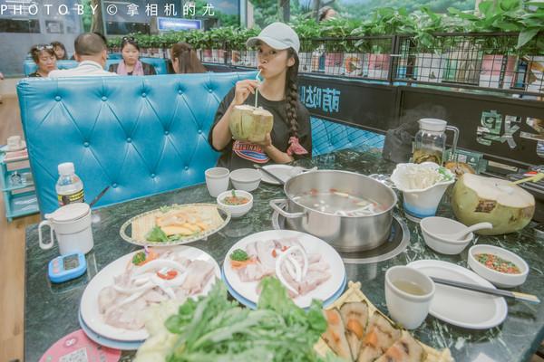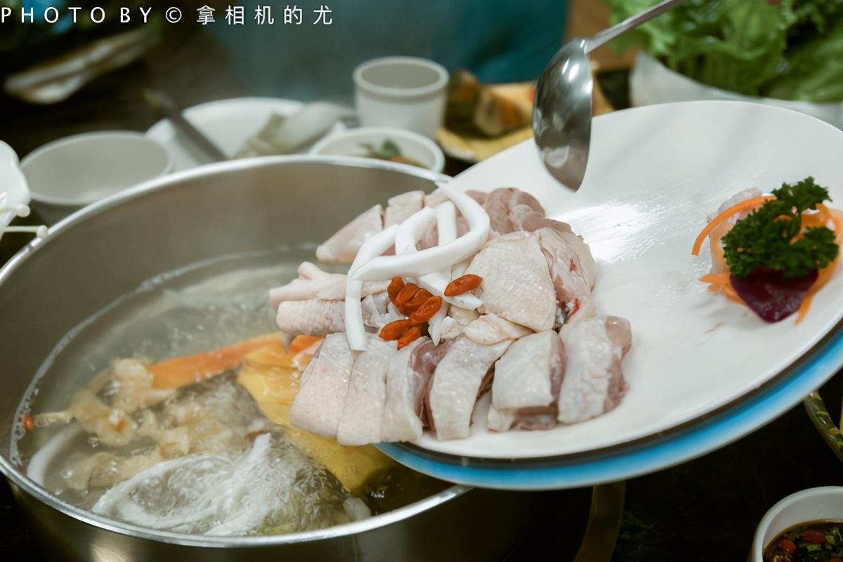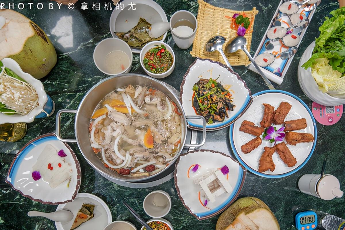 ??我們點(diǎn)的花膠木瓜椰子雞,膠原滿滿地,養(yǎng)顏美容,湯汁更美味。三個(gè)椰子一只文昌雞,和椰肉、花膠、木瓜,珍珠馬蹄、枸杞、紅棗、五指山毛桃等珍貴食材一起煮。喝的是食材本身熬制的湯汁。先喝湯,再吃肉。