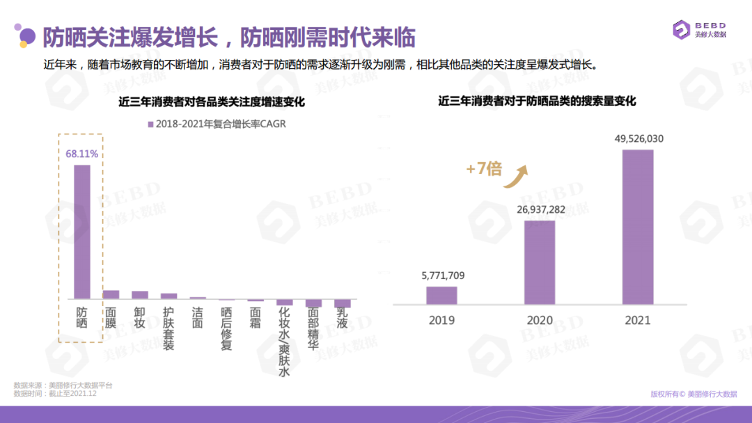 據(jù)美麗修行大數(shù)據(jù)團隊重磅發(fā)布了《2022年防曬行業(yè)趨勢指南》,2018年-2021年,消費者對防曬的需求逐漸升級為剛需,對比其他品類關(guān)注度成爆發(fā)式增長,防曬搜索量2019年-2021年增長7倍。