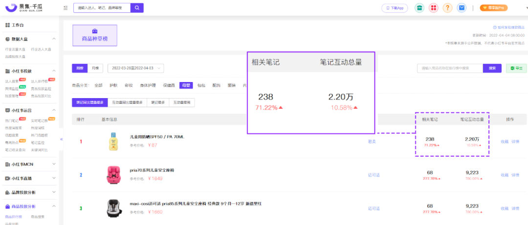 此外,防曬產(chǎn)品已經(jīng)深耕更多細分領(lǐng)域,入局母嬰人群,深受消費者喜愛。在小紅書上搜索“嬰兒防曬”有20萬+篇筆記,果集·千瓜數(shù)據(jù)商品種草榜顯示,小紅書嬰兒防曬的“碧柔兒童防曬乳”3月筆記數(shù)量為572篇,筆記互動總量為6.69萬,種草更多消費人群。