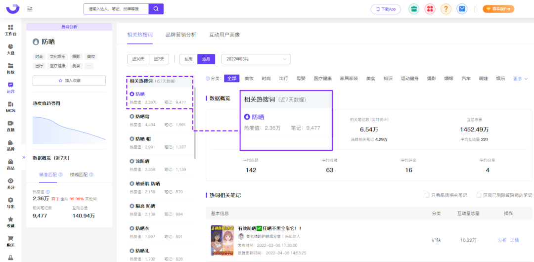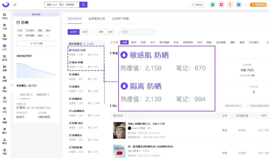 據(jù)果集·千瓜數(shù)據(jù)實時統(tǒng)計,“防曬”3月份在小紅書筆記中共有9477篇相關(guān)熱文,熱度值為17.02萬?!胺罆袢粘;?/strong>深入消費者心理,品牌方也緊緊抓住了迭代的防曬需求,針對性的推出新款功型防曬產(chǎn)品,解決了消費者的防曬顧慮,在功型細分防曬市場中獲得更多增長潛力。