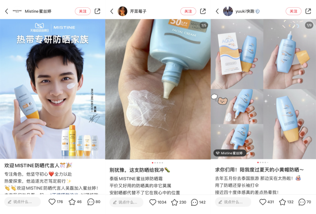 小紅書防曬種草老生常談的產(chǎn)品中,“Mistine蜜絲婷”作為泰國國民品牌,常年雄踞泰國美妝,“Mistine蜜絲婷防曬霜”更是在小紅書上廣受好評,產(chǎn)品平價親民,且泰國位于亞熱帶,常年高溫高濕,紫外線輻射強,蜜絲婷做到了物理加化學(xué)雙重防曬SPF50+ ,高倍防護的同時添加了皺波角叉菜與甘蔗復(fù)合提取物協(xié)同養(yǎng)膚。