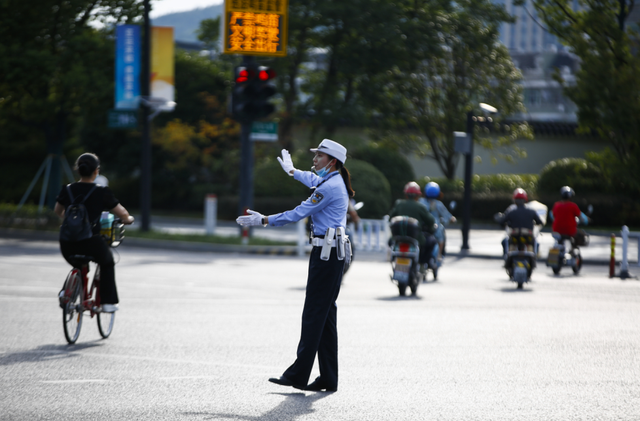 輔警隊(duì)員沈夢(mèng)婷就站在十字路口中央。1米72的個(gè)頭,一雙白手套,隨著哨聲變幻手勢(shì),時(shí)而急促時(shí)而又慢一些,也是夏日熱浪里的風(fēng)景。