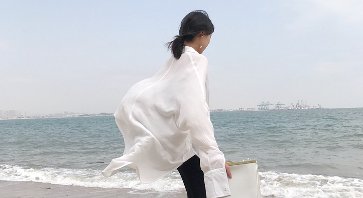 它是介于絲和紗之間的清爽的料子。印花調(diào)整了很久才達到這種若隱若現(xiàn)的果,抽象中國山水畫,線條間不那么分明,有一種朦朧美。領(lǐng)口袖口下擺羅紋收口,黑色細線條清晰流暢。這個顏色版型用料都決定了它既百搭,又很別致吶。