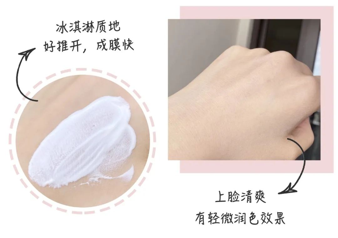 它的質(zhì)地像冰淇淋,輕薄好推開(kāi),成膜快。因?yàn)闆](méi)有添加植物油、礦物油等,膚感比較水潤(rùn)清爽,這點(diǎn)我是真的愛(ài)了,更適合混合皮和油皮,敏感肌痘痘肌也可以使用。