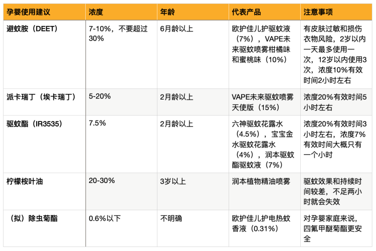 市面上常用的驅(qū)蚊成分主要有避蚊胺(DEET)、派卡瑞丁、驅(qū)蚊酯(IR3 535)、檸檬桉葉油及其提取物PMD、其他植物精油(香茅油、松柏油、桉樹油、大豆油)、(擬)除蟲菊酯等。根據(jù)美國疾病控制與預(yù)防中心(CDC)、美國兒科學(xué)會(AAP)、加拿大健康局和中國香港衛(wèi)生防護(hù)中心的建議: