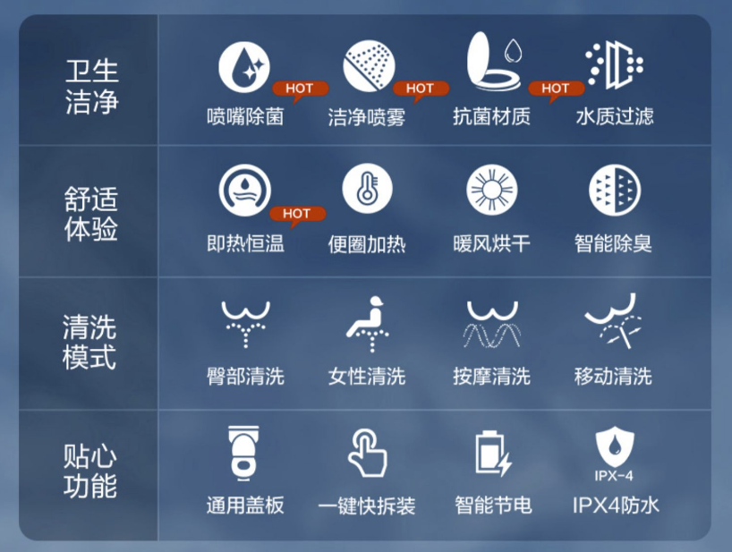 舒適享受:暖風(fēng)烘干、即熱恒溫、便圈加熱、智能除臭;