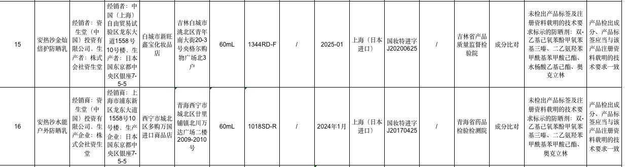 通告顯示,產(chǎn)品標(biāo)簽標(biāo)示為株式會(huì)社資生堂生產(chǎn)、資生堂(中國(guó))投資有限公司經(jīng)銷的“安熱沙金燦倍護(hù)防曬乳”經(jīng)吉林省產(chǎn)品質(zhì)量監(jiān)督檢驗(yàn)院檢驗(yàn),成分比對(duì)不符合規(guī)定,未檢出產(chǎn)品標(biāo)簽及注冊(cè)資料載明的技術(shù)要求標(biāo)示的防曬劑:雙-乙基已氧苯酚甲氧苯基三嗪、二乙氨羥苯甲?;郊姿峒乎?、水楊酸乙基己酯、奧克立林。