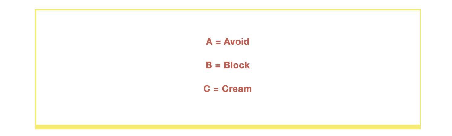 從A到C,依次進(jìn)行,如果可以做到A那么就不要去做到B,如果A做不到就去做B原則,如果B原則也有壓力也一定要把C原則做好,這就是在防曬界的一個(gè)簡(jiǎn)單的ABC原則,防曬霜才是那個(gè)“迫不得已”的選擇。