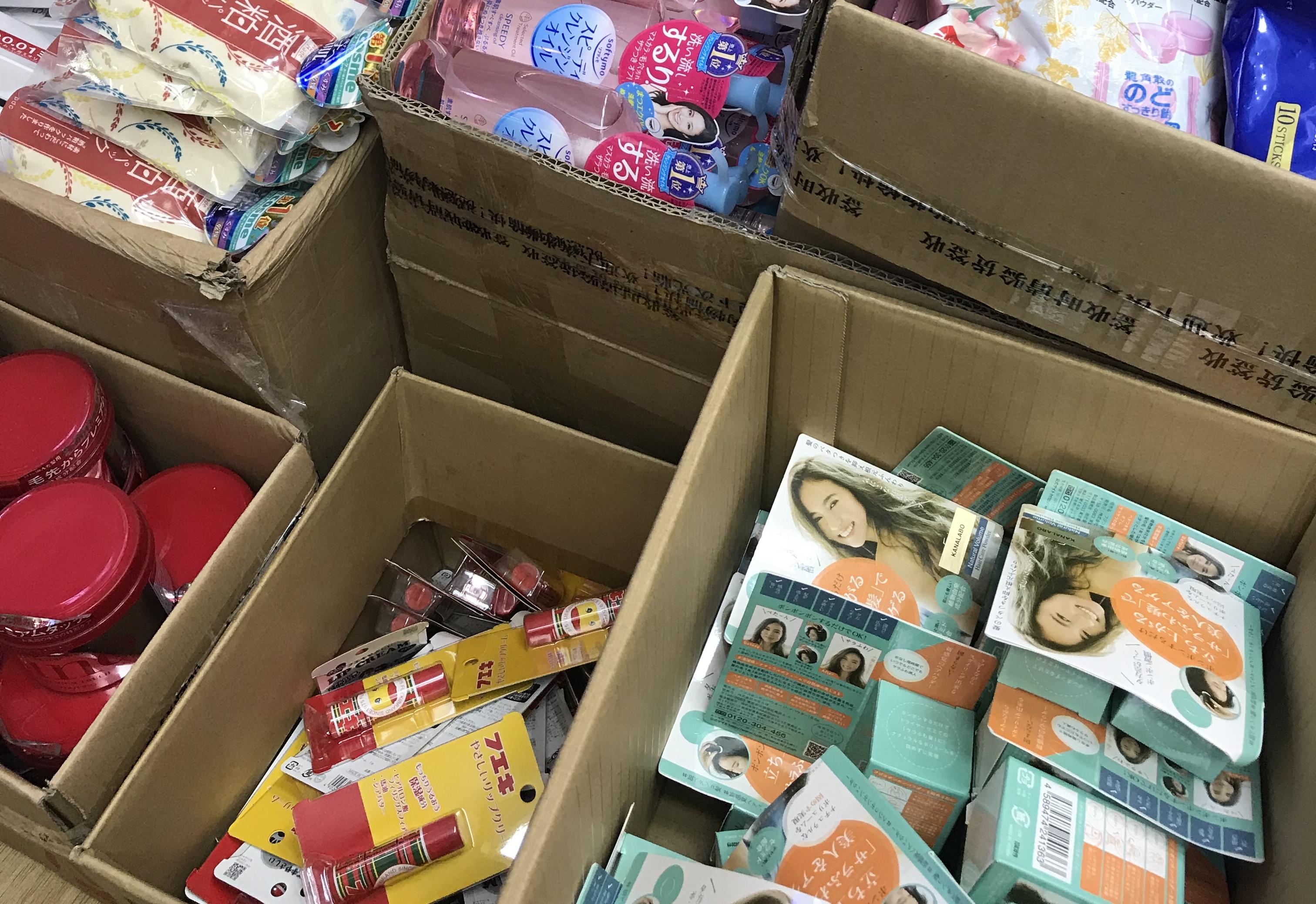 店內(nèi)只留出收銀臺和一條窄窄的通道,地面堆滿了棕色紙皮箱,有的已劃開口子方便客人挑選,有的還是凌亂地放在一角。