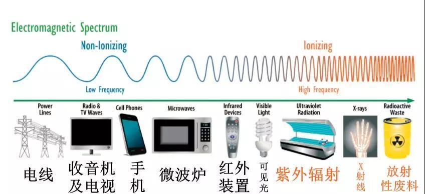 對(duì)照電磁波譜,我們就能發(fā)現(xiàn),在此頻率區(qū)間的電磁波都屬于非電離輻射。